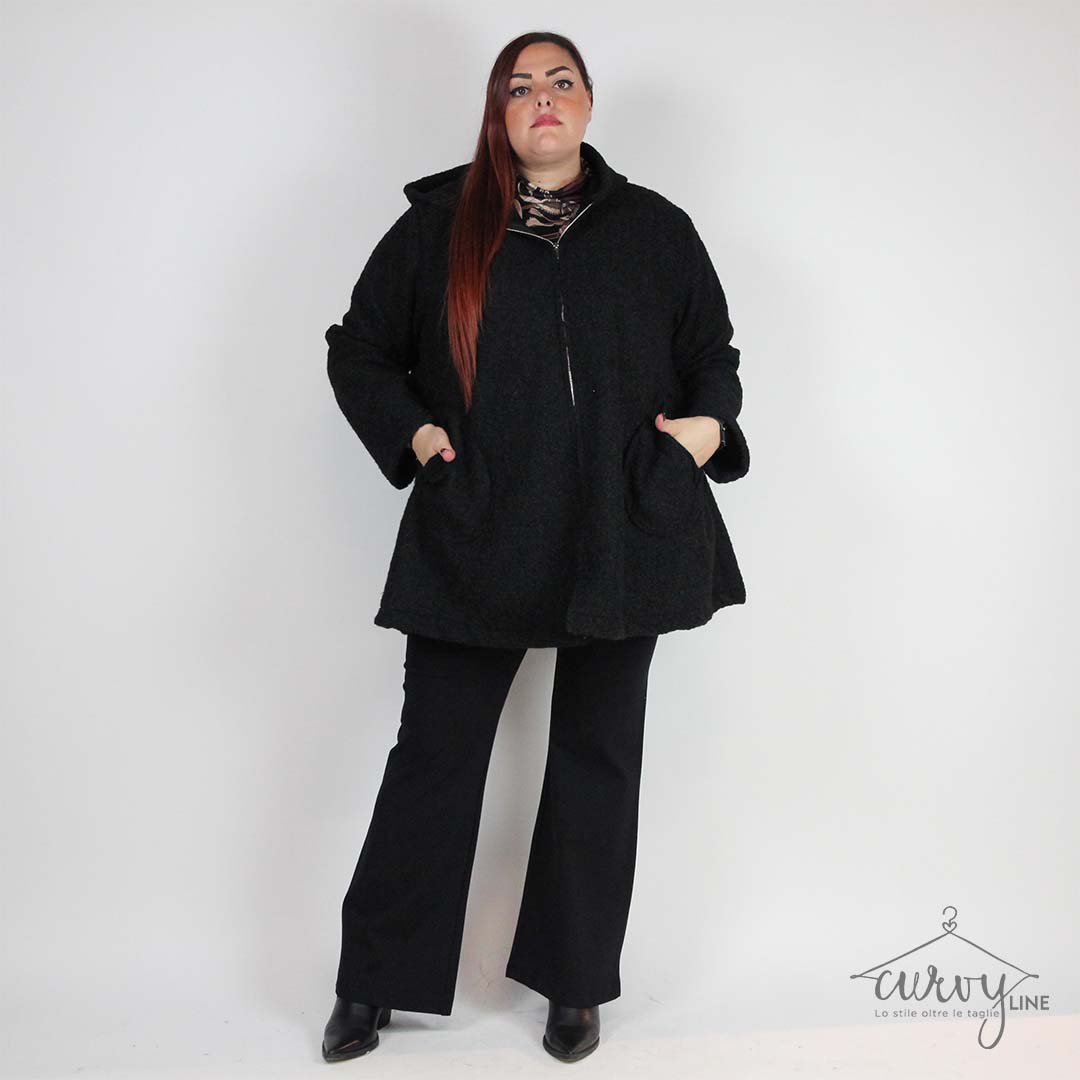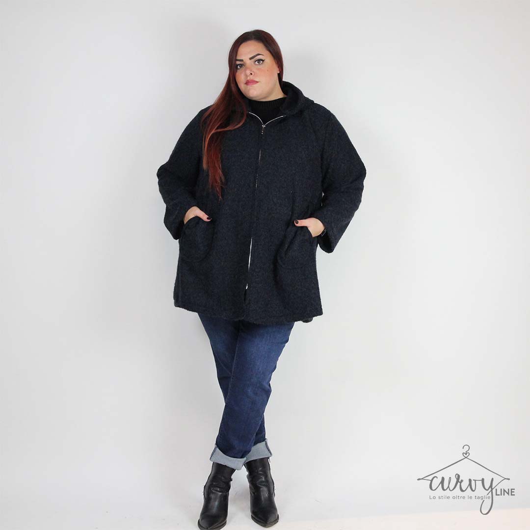 Giacca calda curvy , pelosetta cappuccio, zip tasche.