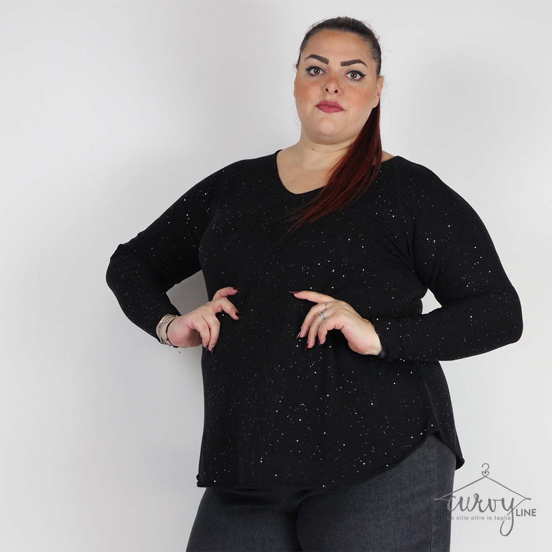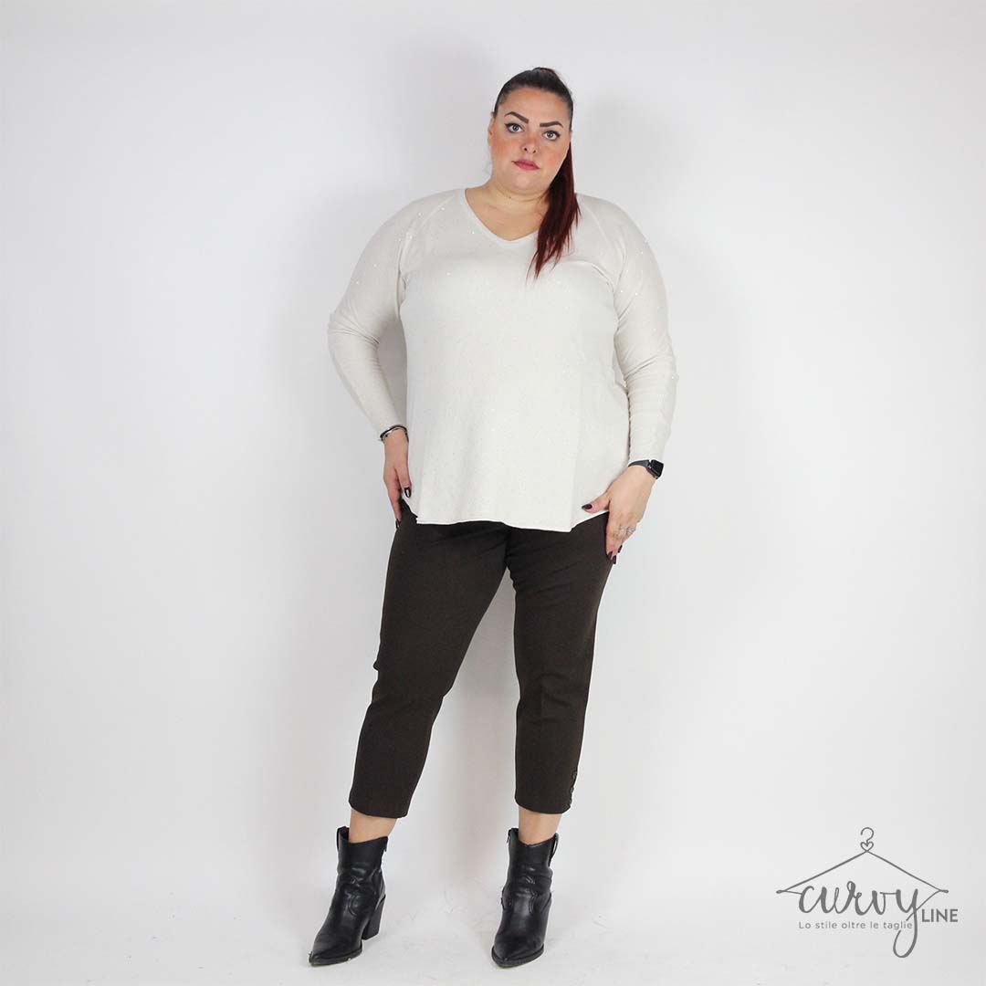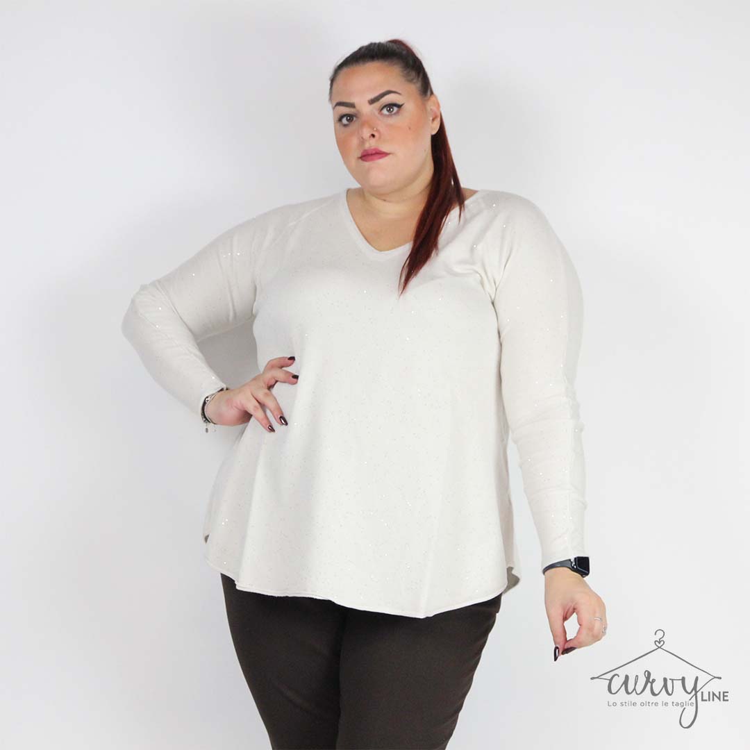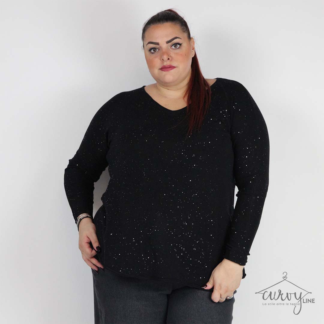 Maglia curvy a trapezio in calda viscosa elasticizzata , scollatura a vi con dettagli luminosi