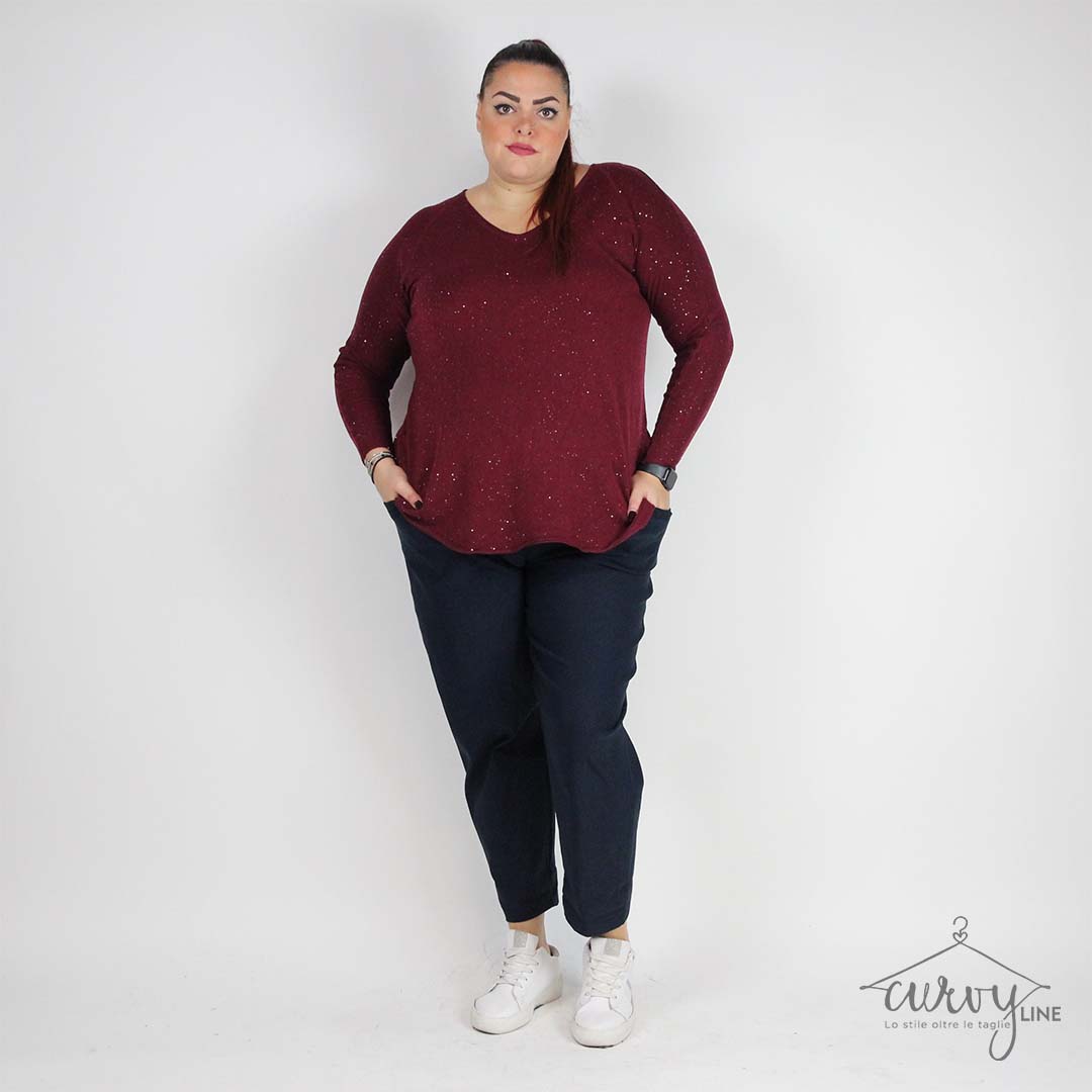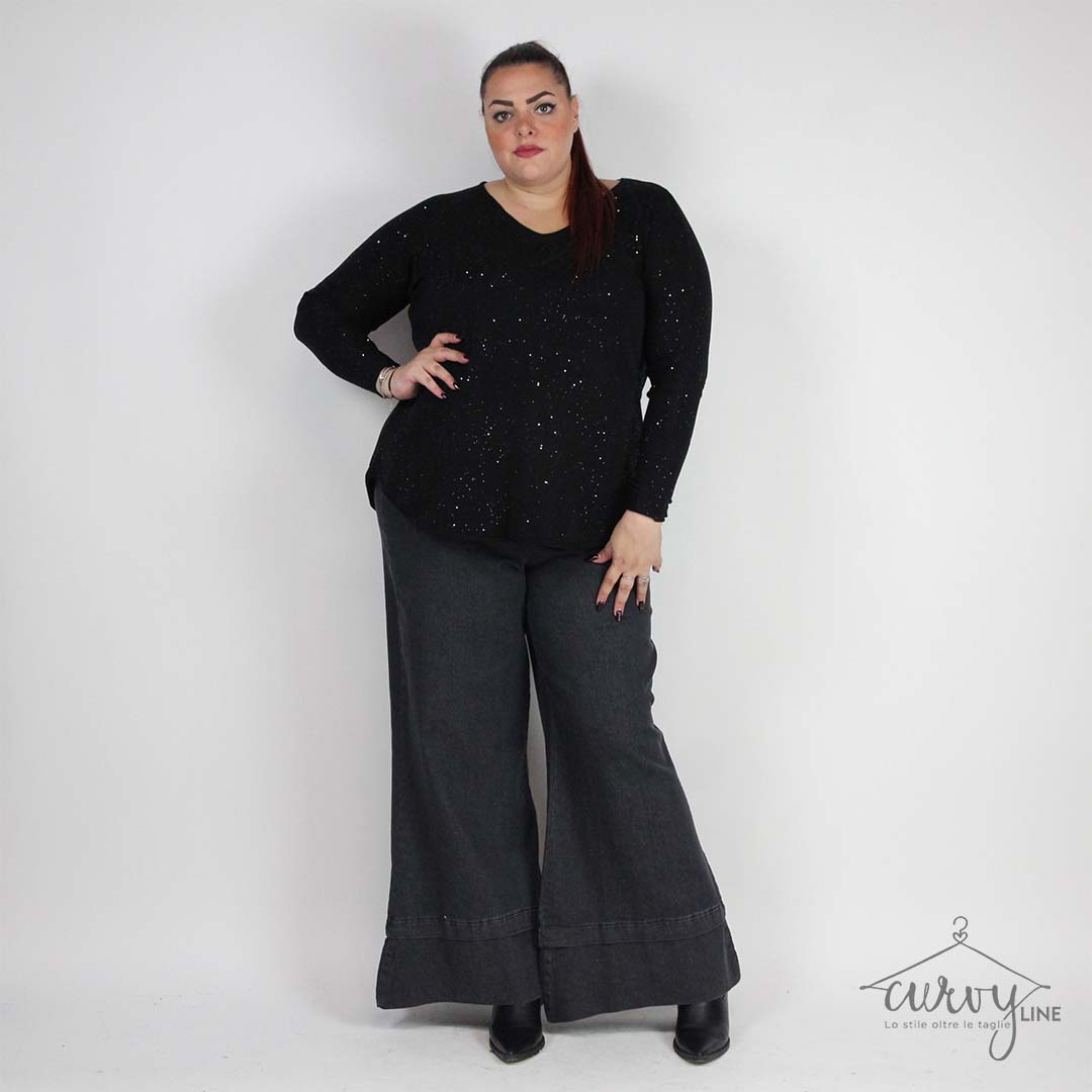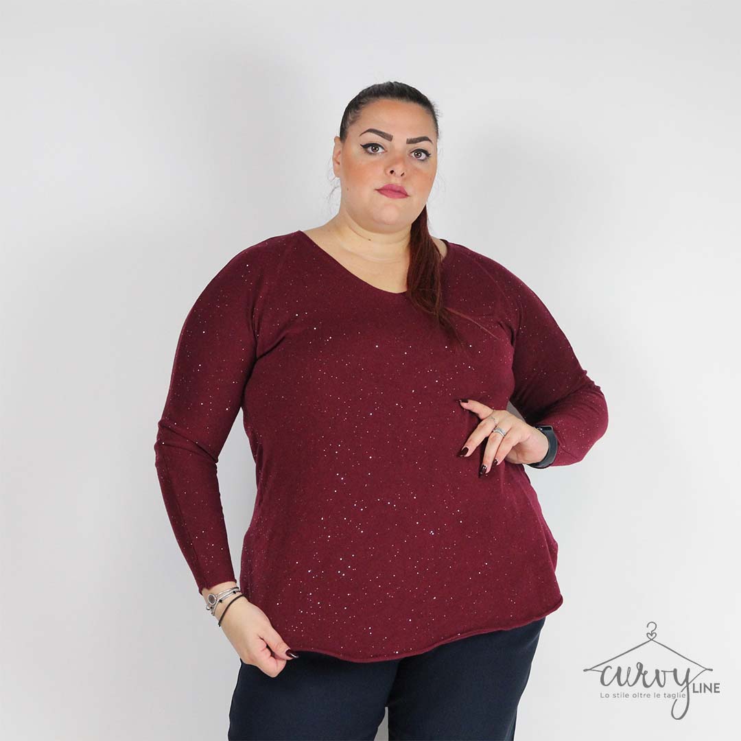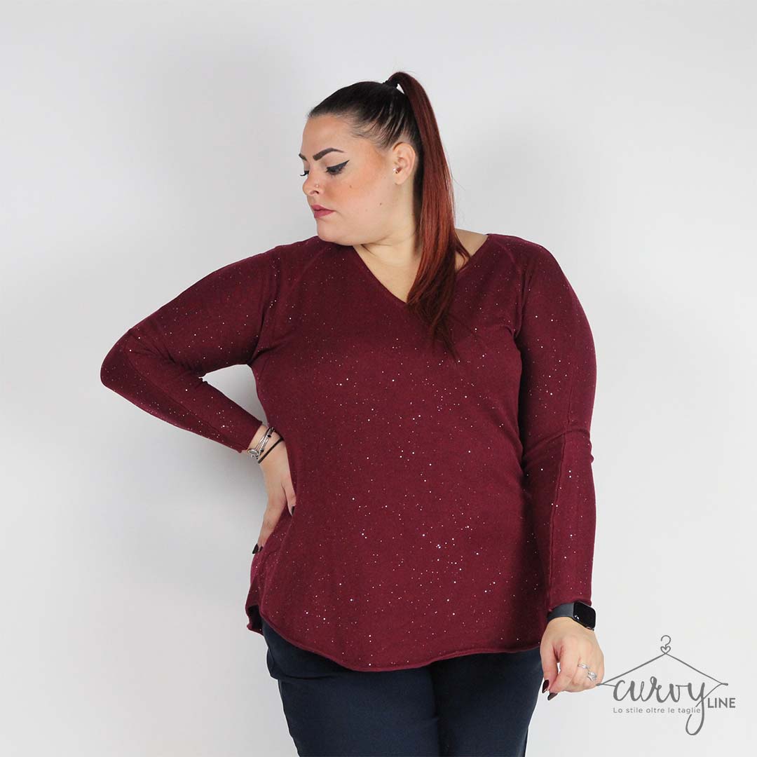 Maglia curvy a trapezio in calda viscosa elasticizzata , scollatura a vi con dettagli luminosi